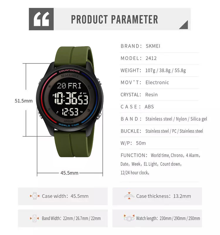 Часы наручные 2412PAG SKMEI, ARMY GREEN-SILICONE