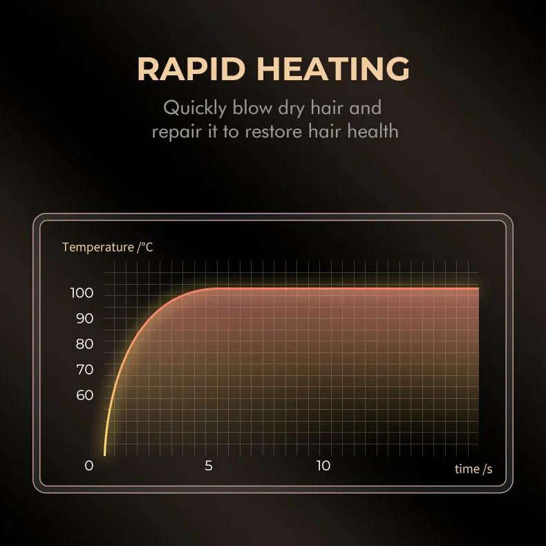 - Регулировка обдува и температуры: 40 уровней обдува (7000–11 000 об/мин) и 40 температурных режимов (60–100°C) позволяют точно настроить фен под индивидуальные потребности.