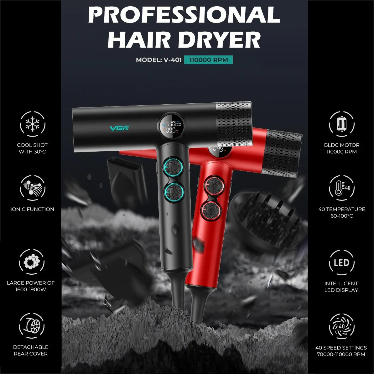 Профессиональный фен VGR V-401 RED — идеальный выбор для тех, кто ценит высокое качество и функциональность в уходе за волосами. С максимальной мощностью 1900 Вт и бесщеточным двигателем, работающим на скорости до 110 000 об/мин, он обеспечивает стабильный поток воздуха и долговечность устройства.