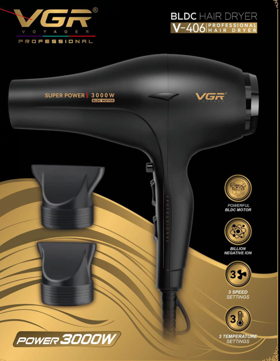 VGR V‑406 — профессиональный фен для волос 3000 Вт с 3 уровнями обдува и 3 температурными режимами