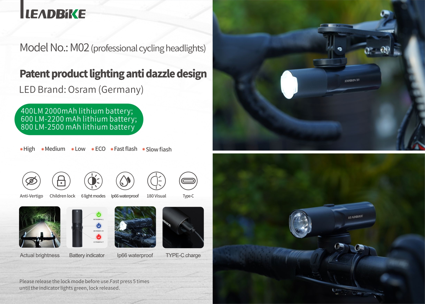 Велофара мощная LEADBIKE M02-OSRAM 800LM, 2500mAh,waterproof, children lock, Li-Ion аккум., ЗУ Type-C оптом в Украине